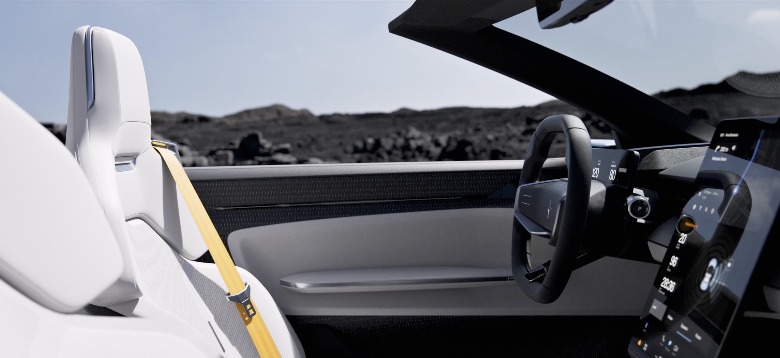 With Polestar on a high-profile sustainability journey, however, what the O2 concept is made from is just as important. Inside, for example, there’s been heavy use of what’s described as a mono-material: basically a single base material that’s used in different ways for different components.